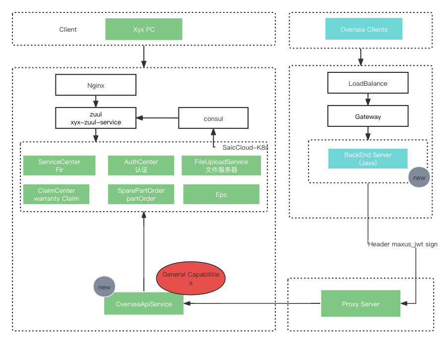 Describes the server-to-server communication between Maxus's backend services and overseas backend services.